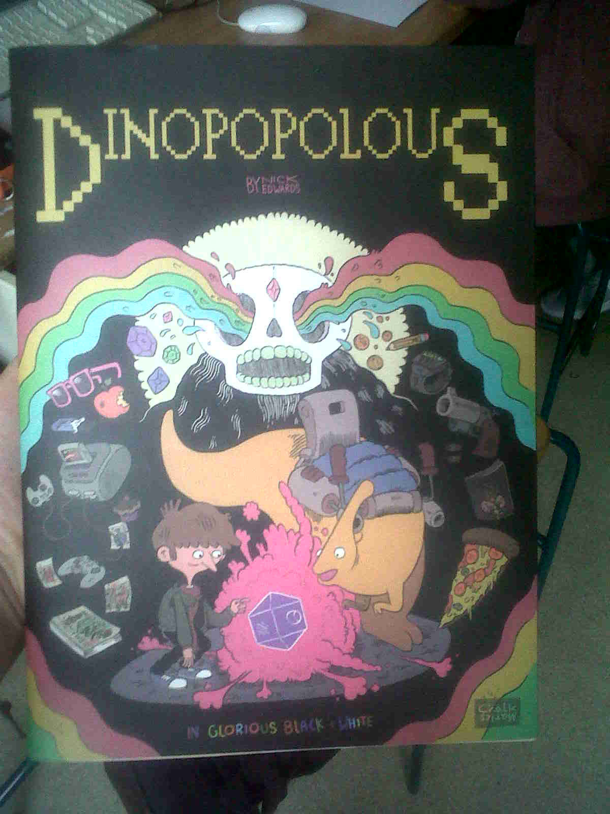 This is the cover of Nick Edwards' Dinopopolous, it gave me the idea to put my map onto the cover of a book under the slip cover. As you can see in the pictures this piece is also underneath the slip cover.